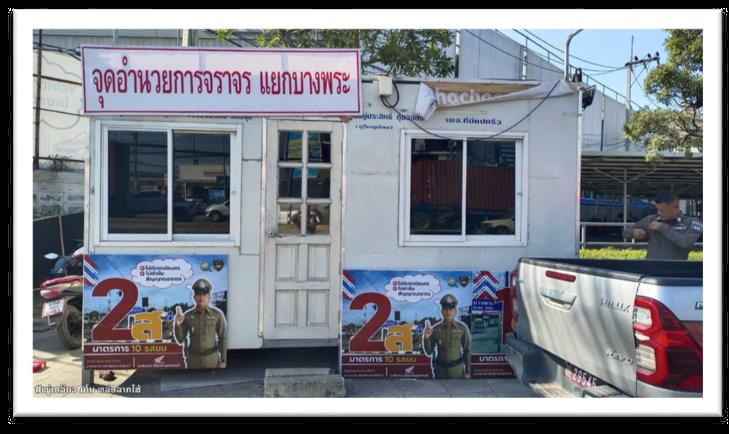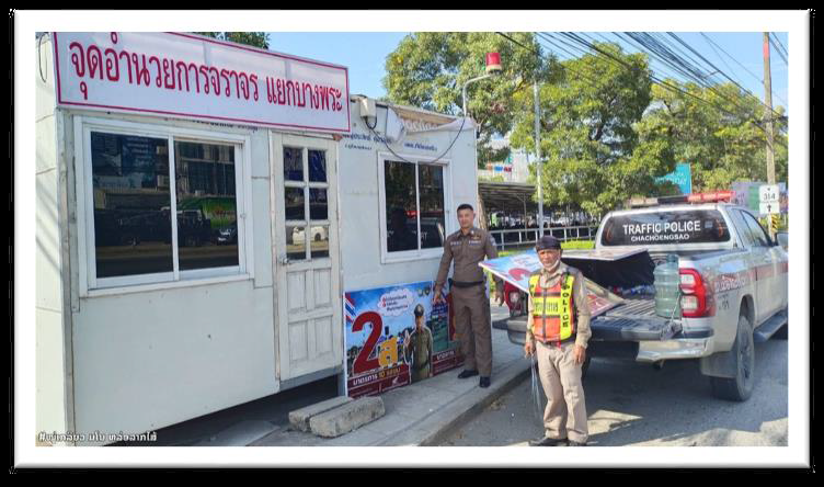 พ.ต.ต. .ประจักษ์ บุญณะอินทร์ สว.จร. สภ.เมืองฉะเชิงเทรา สั่งการให้ เจ้าหน้าที่ตำรวจจราจรพร้อมด้วยอาสาจราจร ดำเนินการติดตั้งป้ายประชาสัมพันธ์ศูนย์อำนวยการจราจรช่วงเทศกาลปีใหม่ บริเวณ แยกเทศบาล 2