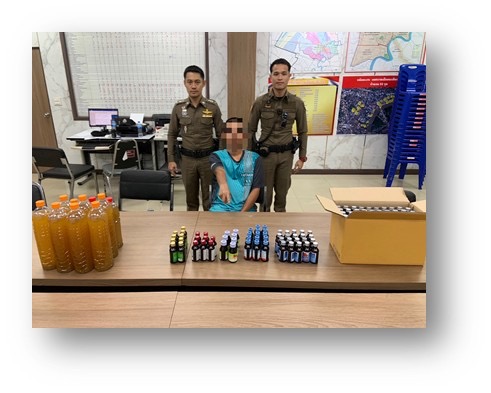 ผู้ต้องหา 1 ราย ในความผิดฐาน “โดยกล่าวหาว่า “ฝ่าฝืนประกาศกระทรวงสาธารณสุข (ฉบับที่ ๔30) พ.ศ. ๒๕๖๔ ออกตามความนัย พระราชบัญญัติอาหาร พ.ศ. ๒๕๒๒ เรื่องกำหนดอาหารที่ห้ามผลิต นำเข้า หรือจำหน่าย ตามบัญชีแนบท้ายประกาศ ลำดับที่ ๕๒ (กระท่อม) อันเป็นความผิดตามมาตรา ๕๐ ของพระราชบัญญัติอาหาร พ.ศ. ๒๕๒๒ ขายยาแผนปัจจุบัน (ยาแก้ไอ) โดยไม่ได้รับอนุญาตประกอบวิชาชีพเภสัชกรรม โดยไม่ได้ขึ้นทะเบียนและรับอนุญาต