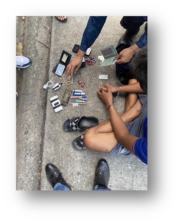 พร้อมด้วยของกลางเป็นทรัพย์ถูกประทุษร้ายของผู้เสียหายจำนวนหลายรายการ รวมถึงยานพาหนะที่คนร้ายใช้ก่อเหตุ ตลอดจนเสื้อผ้าเครื่องแต่งกายที่คนร้ายใช้สวมใส่ขณะก่อเหตุ ซึ่งปรากฏตรงตามภาพจากกล้องวงจรปิดทุกประการ จึงเเจ้งข้อกล่าวหาพร้อมทั้งฐานความผิดให้ผู้ต้องหาทั้งสองทราบว่า