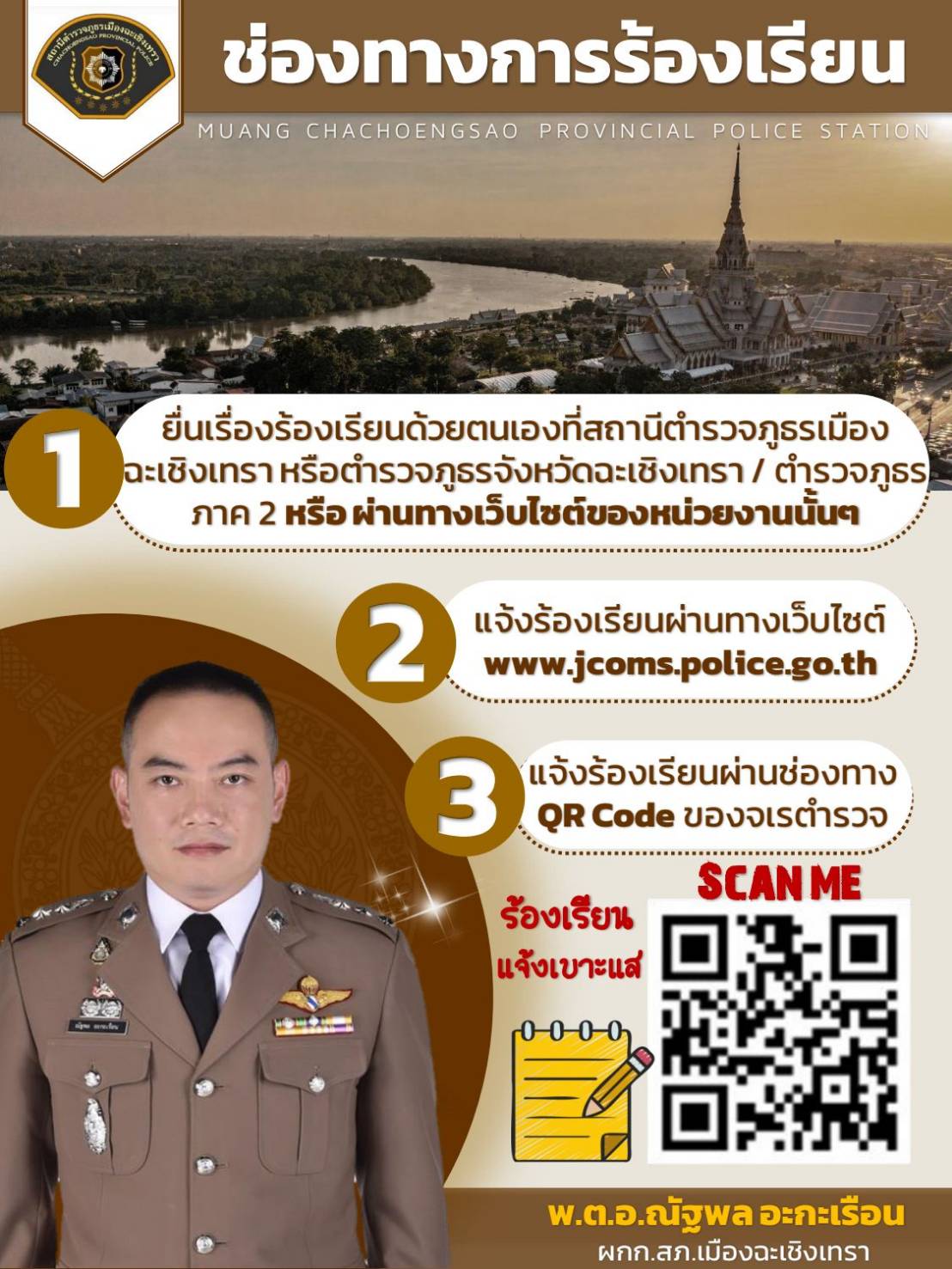 1.ยื่นเรื่องร้องเรียนด้วยตนเองที่สถานีตำรวจใกล้บ้านหรือตำรวจภูธรจังหวัดฉะเชิงเทรา / ตำรวจภูธรภาค 2 หรือ ผ่านทางเว็บไซต์ของหน่วยงานนั้นๆ