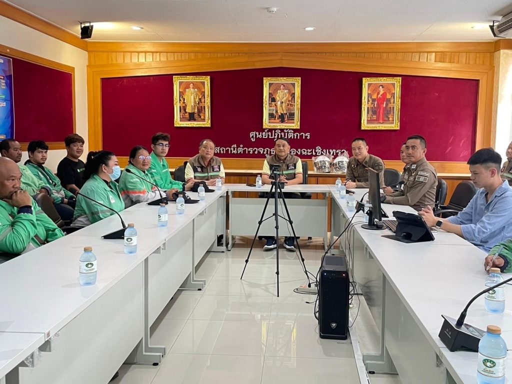 พร้อมด้วย คณะ กต.ตร.สภ.เมืองฉะเชิงเทรา นำโดย นายประชา คล้ายสิงห์ ประธาน กต.ตร.สภ.เมืองฉะเชิงเทรา ,นายเจริญ มหาโภคา ประธาน กต.ตร.ด้านการจราจร ร่วมกันรณรงค์ให้ความรู้เกี่ยวกับการขับขี่ปลอดภัยให้กับกลุ่มผู้ประกอบการขนส่งไรเดอร์(Lineman) ในพื้นที่จังหวัดฉะเชิงเทรา เพื่อเป็นการเตรียมความพร้อมการขับขี่ปลอดภัยในช่วงเทศกาลสงกรานต์ 25567