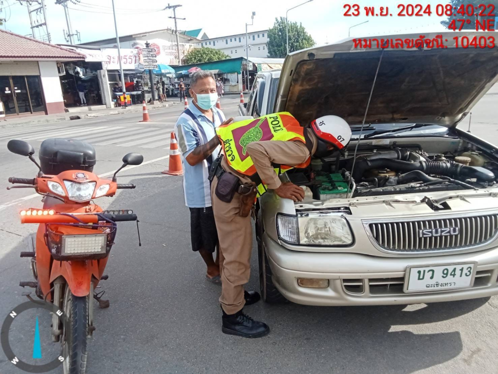 โดย อส.จร.สมชาติ หวดสันเที๊ยะ(จร.07)และ อส.จร.สุรชาติ เสร็จธุระ(จร.06) ขณะปฏิบัติหน้าที่ช่วยเหลือเจ้าหน้าที่ตำรวจจราจร สภ.เมืองฉะเชิงเทรา อำนวยความสะดวกการจราจรบริเวณ หน้าวัดโสธรวรารามวรวิหาร พบรถยนต์กระบะระบบคลัตช์เสีย จึงได้ช่วยกันซ่อมและเปลี่ยนอะไหล่ จนสามารถเดินทางต่อไปได้