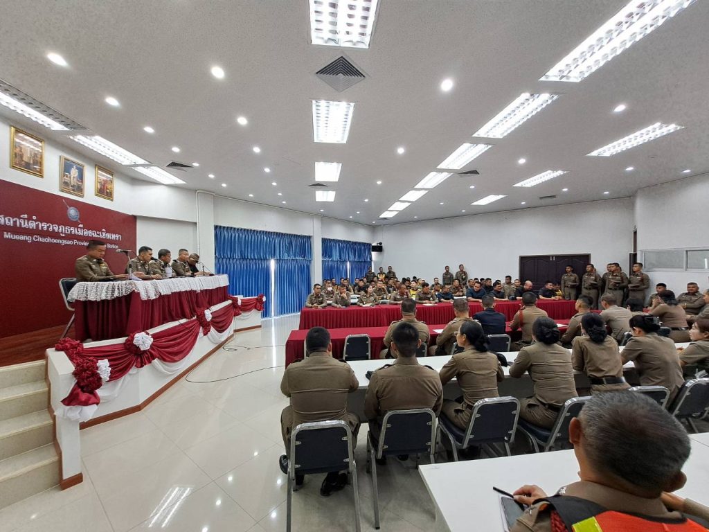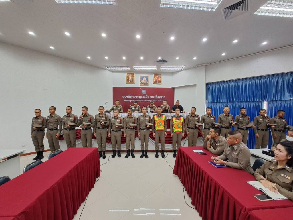 วันที่ 4 เม.ย 68 เวลา 09.00 น. พ.ต.อ.ภูริทัต บุญช่วย ผกก.สภ.เมืองฉะเชิงเทรา พ.ต.ท.นำโชค คุณาวิชชา รอง ผกก.ป.สภ.เมืองฉะเชิงเทรา พ.ต.ท.เตชทัต เนตรุวงค์ รอง ผกก.จร.สภ.เมืองฉะเชิงเทรา พ.ต.ท.สราวุธ ศรีรักยิ้ม รอง ผกก.สส.สภ.เมืองฉะเชิงเทรา พ.ต.ท.ฉัตรชัย ตาวัน รอง ผกก.(สอบสวน)สภ.เมืองฉะเชิงเทรา พร้อมด้วยข้าราชการตำรวจ สภ.เมืองฉะเชิงเทรา ร่วมประชุมมอบนโยบายในการปฏิบัติหน้าที่และกำชับข้อสั่งการของผู้บังคับบัญชา พร้อมทั้งแนะนำข้าราชการตำรวจที่ดำรงตำแหน่งใหม่ ณ ห้องประชุมชั้น 4 สภ.เมืองฉะเชิงเทรา