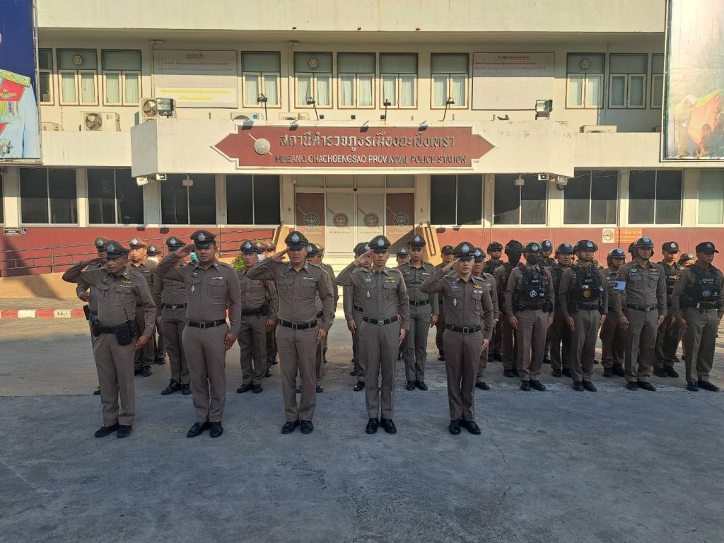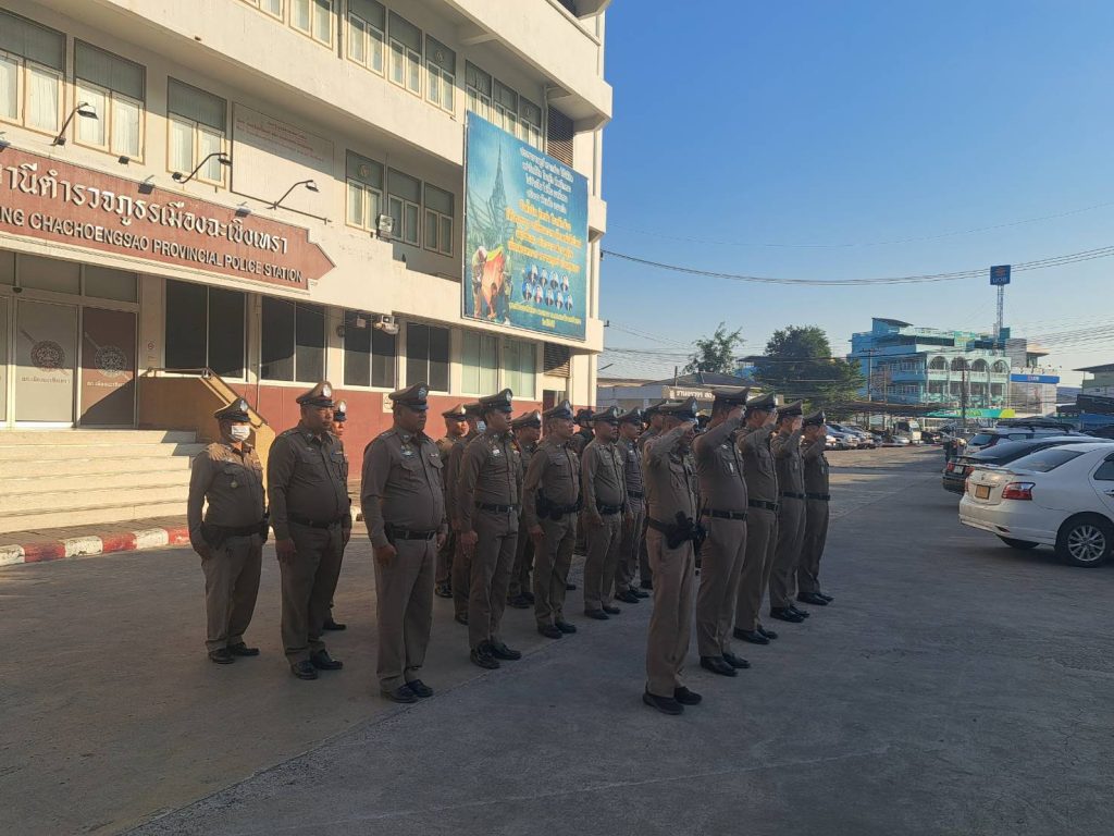 ร่วมกิจกรรมเข้าแถวเคารพธงชาติ และยืนสงบนิ่ง พร้อมกล่าวคำอุดมคติตำรวจ ตามแนวทางการยกระดับการบริการประชาชนบนสถานีตำรวจและเพื่อแสดงออกถึงความจงรักภักดีต่อสถาบันชาติ ศาสนา พระมหากษัตริย์ ณ หน้า สภ.เมืองฉะเชิงเทรา