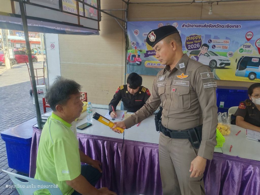 ร่วมกับเจ้าหน้าที่ขนส่งจังหวัดฉะเชิงเทรา เจ้าหน้าที่สถานีขนส่งผู้โดยสารฉะเชิงเทรา ร่วมกัน ตรวจความพร้อม ผู้ขับขี่รถโดยสารประจำทาง และดูแลความปลอดภัย ผู้โดยสารที่จะเดินทางกลับภูมิลำเนา ในช่วงเทศกาลปีใหม่ 2569