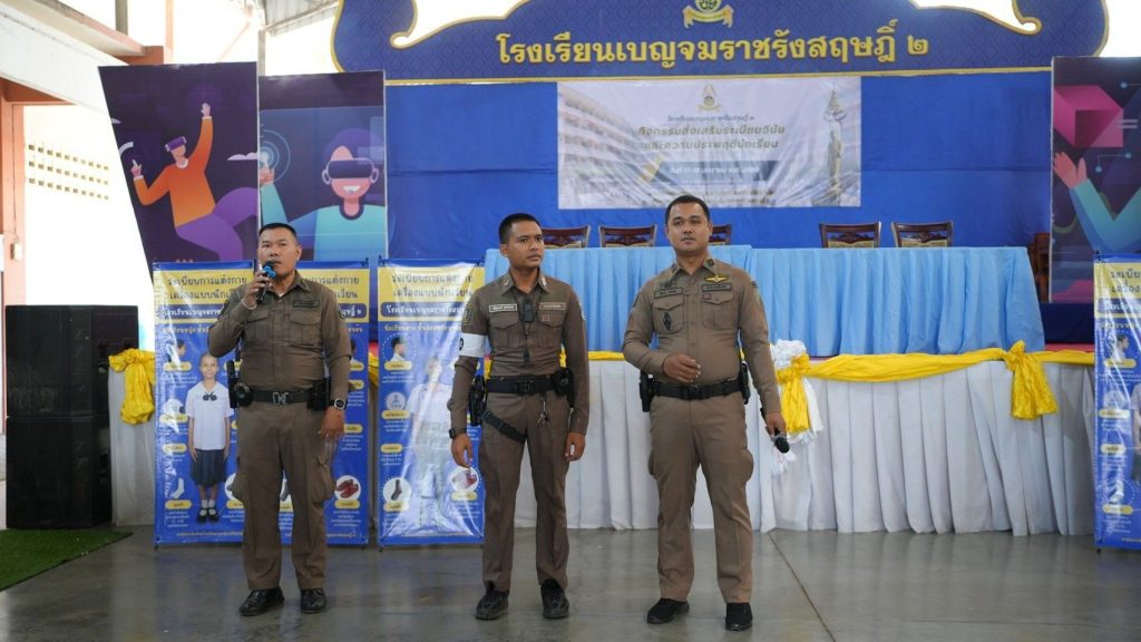 พ.ต.ต.พัฒนา หรั่งฟัก สวป.(ชส.)สภ.เมืองฉะเชิงเทรา พร้อมเจ้าหน้าตำรวจ สภ.เมืองฉะเชิงเทรา ร่วมเป็นวิทยาการบรรยายในกิจกรรมส่งเสริมระเบียบวินัยและการอยู่ร่วมกันในสังคม ณ โรงเรียนเบญจมราชรังสฤษฎิ์ 2