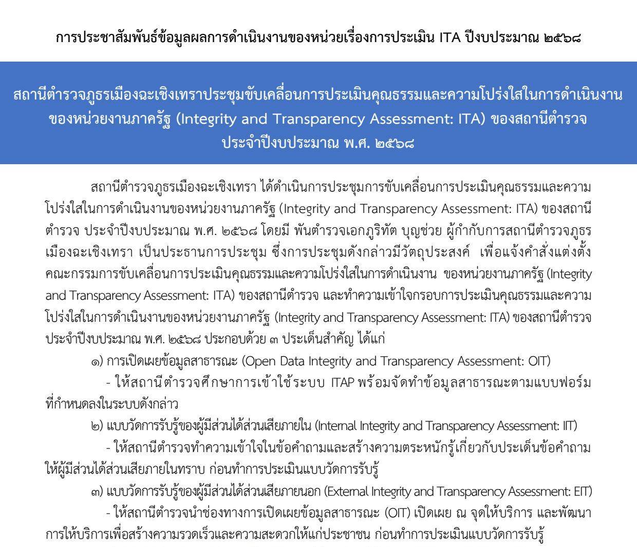 O6 การประชาสัมพันธ์ข้อมูลข่าวสาร ข่าวประชาสัมพันธ์ จับกุมผู้ต้องหา เมาแล้วขับ จำนวน 5 ราย วันที่ 30 ธ.ค.2568 เวลา 18.00 – 20.00 น. ภายใต้กา... ตรวจความพร้อม ผู้ขับขี่รถโดยสารประจำทาง และดูแลความปลอดภัย ผู้โดยสารที่จะเดินทางกลับภูมิลำเนา ในช่วงเทศกาลปีใหม่ 2569 วันที่ 30 ธันวาคม 2568 เวลา 11.30 น. ภายใต้การอํานวยการ... ตรวจสถานที่จัดงาน คอนเสิร์ตบริเวณหน้าห้างโรบินสันฉะเชิงเทรา วันที่ 29 ธันวาคม 2568 เวลา 15.45 น. พ.ต.อ.พงศ์สัณห์ มี... 12345›» กดที่ภาพด้านบนเพื่อทำแบบประเมิน หรือ เข้าตามลิงก์นี้ https://itap.nacc.go.th/s/F74893658 การประชาสัมพันธ์ข้อมูลการประเมิน ITA ของ สภ.เมืองฉะเชิงเทรา ประจำปีงบประมาณ 2568 กดที่นี่ ข่าวสารการประชาสัมพันธ์ข้อมูลการตอบแบบวัด EIT ของ สภ.เมืองฉะเชิงเทรา กดที่นี่